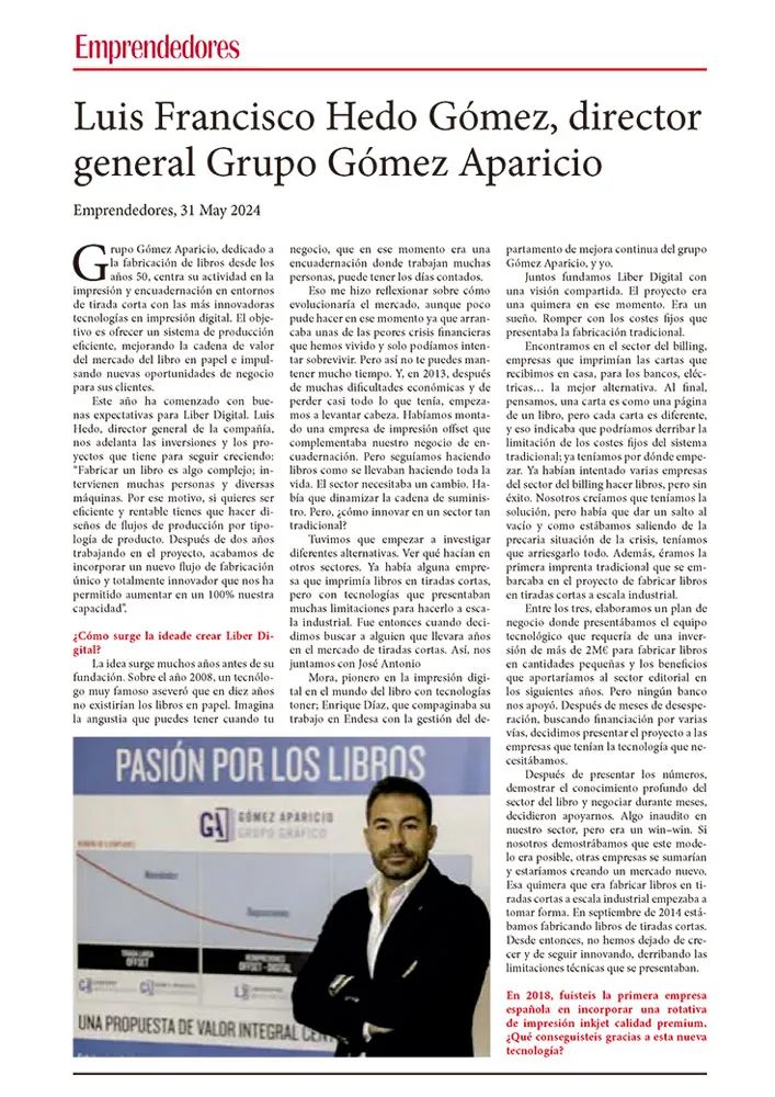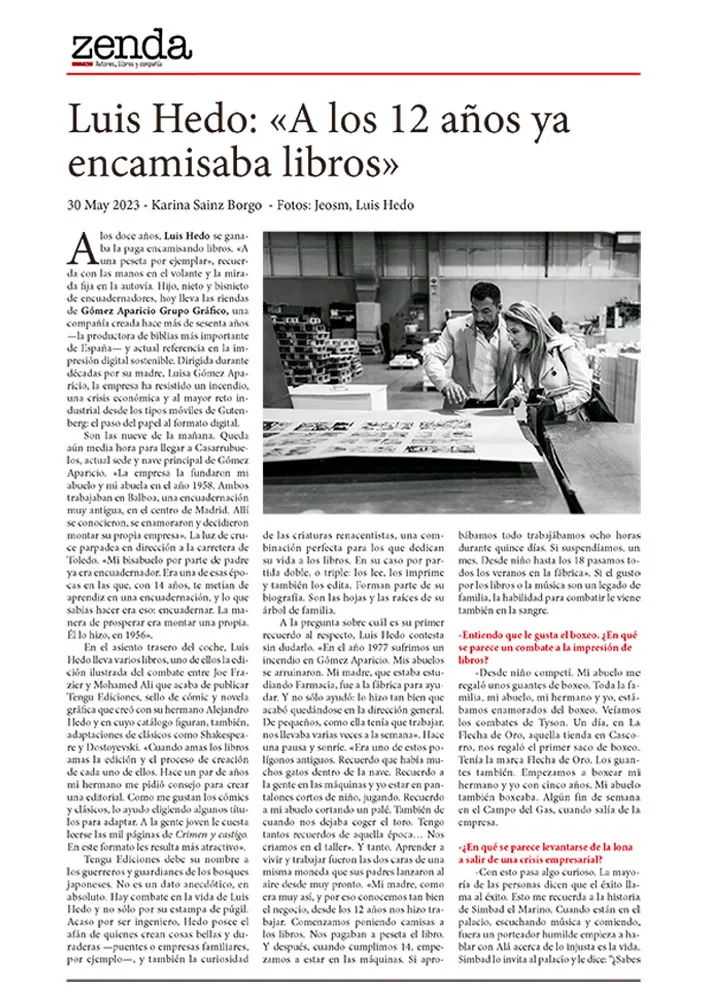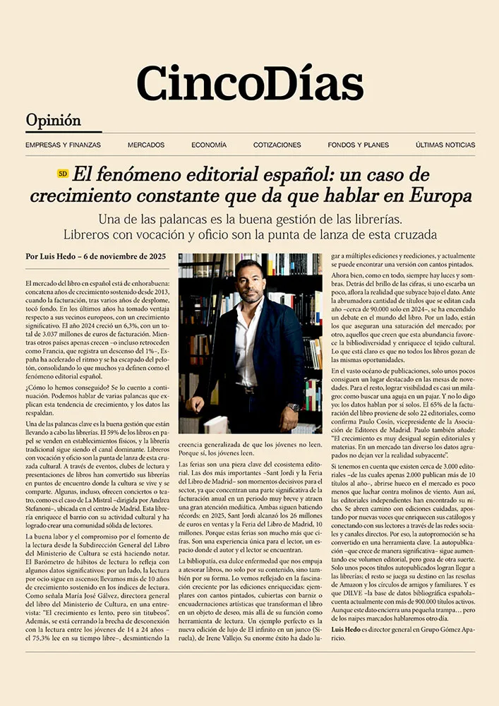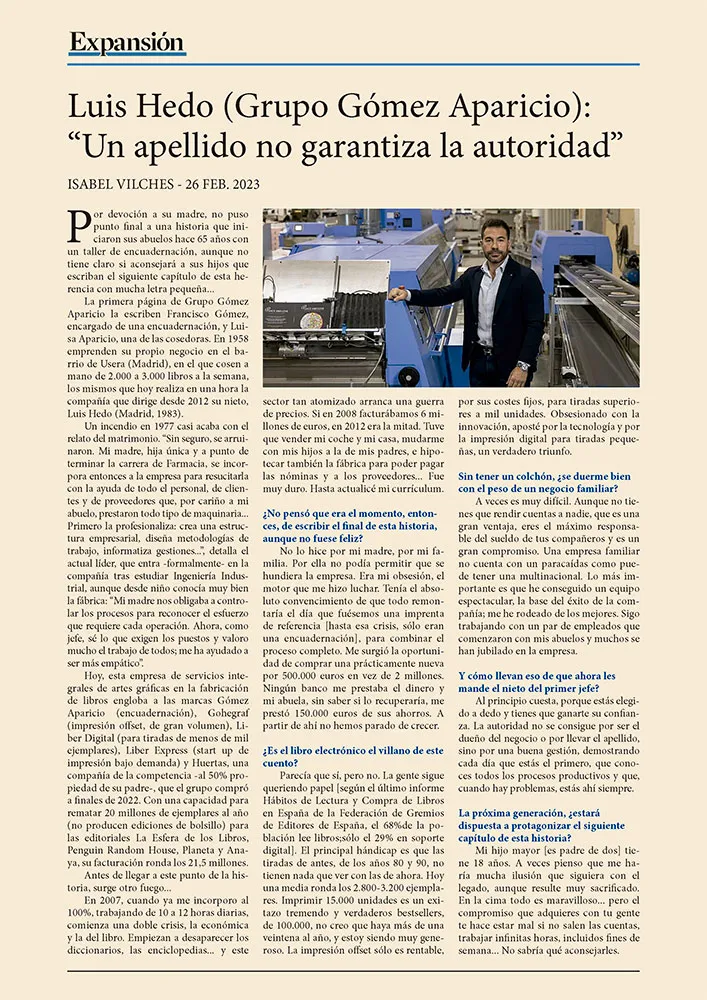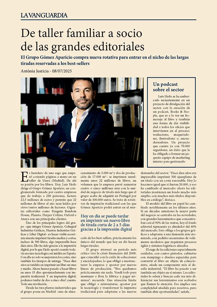 El Grupo Gómez Aparicio nació en 1958 como un taller de encuadernación fundado por su abuelo. Luis Hedo creció entre pliegos y lomos de libros: con doce años ya «encamisaba» ejemplares por unas pesetas, aprendiendo el oficio desde abajo y el valor del trabajo bien hecho.